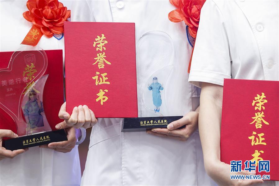 5月11日,工作人員整理印有援鄂隊(duì)員工作照的獎杯。在國際護(hù)士節(jié)到來之際,北京大學(xué)人民醫(yī)院11日舉辦慶祝護(hù)士節(jié)暨優(yōu)秀集體和個(gè)人表彰活動,并邀請?jiān)踽t(yī)療隊(duì)護(hù)士代表分享戰(zhàn)“疫”故事。我國今年護(hù)士節(jié)的主題為“致敬護(hù)士隊(duì)伍,攜手戰(zhàn)勝疫情”。新華社記者張玉薇攝