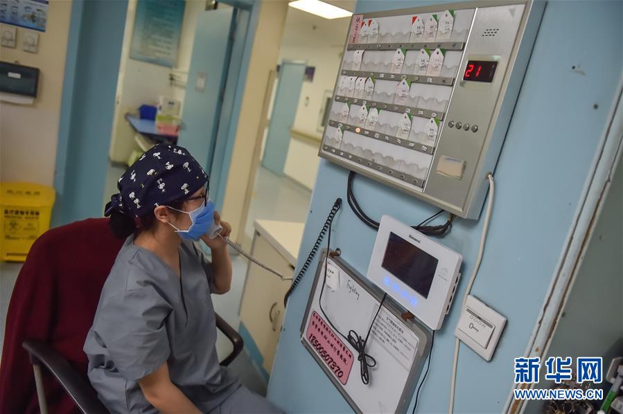 5月11日,在北京地壇醫(yī)院感染二科護(hù)士站,護(hù)士彭蒨接聽(tīng)病房呼喚鈴電話。北京地壇醫(yī)院是北京市收治新冠肺炎患者的定點(diǎn)醫(yī)院之一,醫(yī)院的醫(yī)護(hù)人員一直奮戰(zhàn)在抗擊疫情的一線。在國(guó)際護(hù)士節(jié)前夕,記者前往北京地壇醫(yī)院,記錄下抗疫一線護(hù)士的日常工作狀態(tài)。新華社記者彭子洋攝
