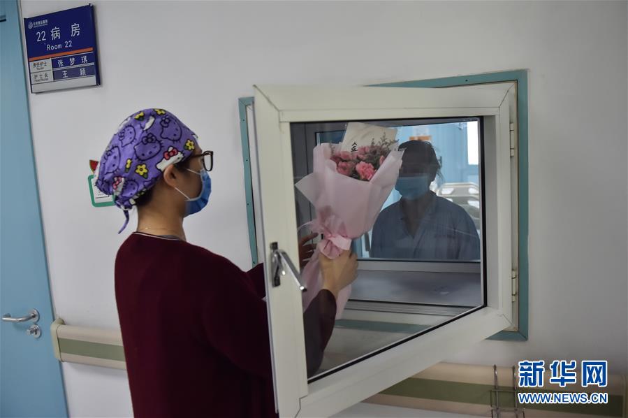 5月11日,在北京地壇醫(yī)院感染二科病房外,一名護(hù)士向病人轉(zhuǎn)交病人女兒送來的鮮花。北京地壇醫(yī)院是北京市收治新冠肺炎患者的定點(diǎn)醫(yī)院之一,醫(yī)院的醫(yī)護(hù)人員一直奮戰(zhàn)在抗擊疫情的一線。在國(guó)際護(hù)士節(jié)前夕,記者前往北京地壇醫(yī)院,記錄下抗疫一線護(hù)士的日常工作狀態(tài)。新華社記者彭子洋攝