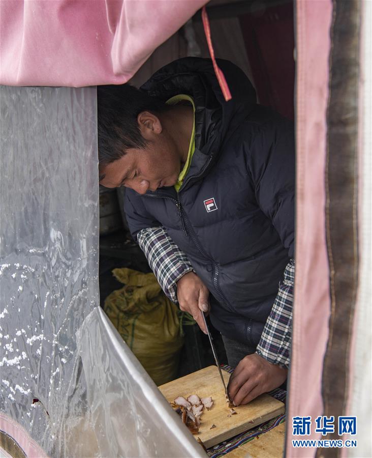 在海拔6500米的前進(jìn)營(yíng)地,高山廚師在準(zhǔn)備菜品(5月10日攝)。新華社記者孫非攝