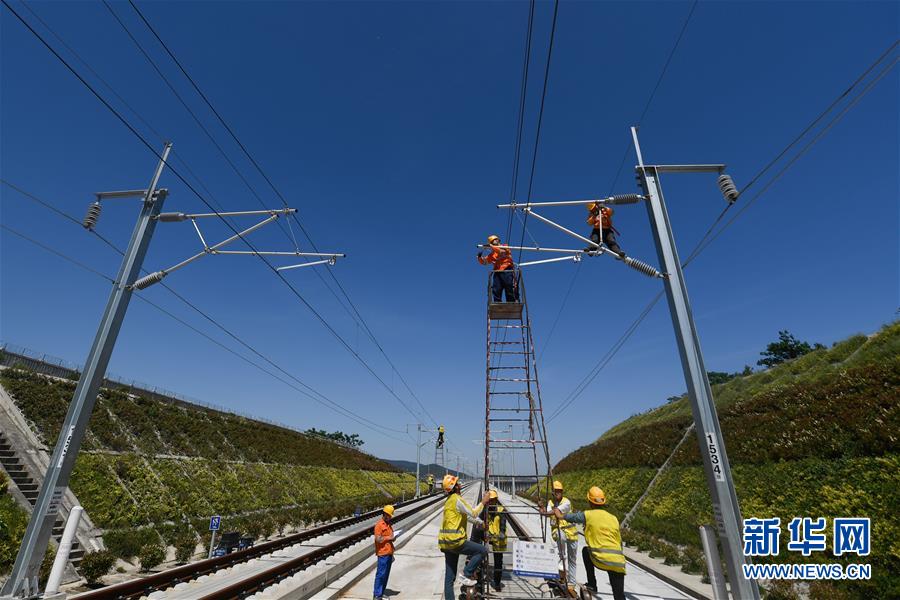 5月12日,中國鐵路上海局集團(tuán)公司上海高鐵維修段的技術(shù)人員在商合杭高鐵浙江湖州段調(diào)整接觸網(wǎng)導(dǎo)線。近日,商合杭高鐵合肥至湖州段聯(lián)調(diào)聯(lián)試正有條不紊進(jìn)行中。中國鐵路上海局集團(tuán)公司上海高鐵維修段抽調(diào)49名精兵強(qiáng)將,持續(xù)對管轄范圍內(nèi)的高鐵線路、信號(hào)、接觸網(wǎng)線進(jìn)行調(diào)試,為下一階段打下基礎(chǔ)。據(jù)了解,商合杭高鐵合湖段聯(lián)調(diào)聯(lián)試之后將轉(zhuǎn)入運(yùn)行試驗(yàn)階段,驗(yàn)收合格并通過安全評估后,力爭6月底具備開通運(yùn)營條件。新華社記者黃宗治攝