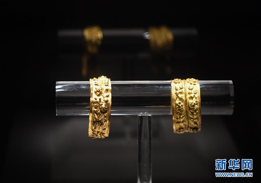 這是在廣東陽江海陵島的廣東海上絲綢之路博物館展出的“南海I號”出土文物金鉗鐲(5月12日攝)。新華社記者鄧華攝