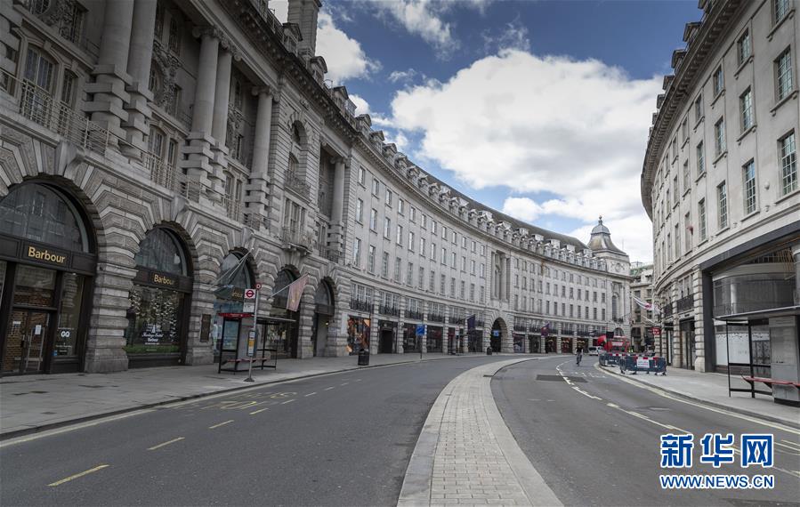 5月12日,英國(guó)倫敦主要商業(yè)街之一的攝政街上的店鋪全部關(guān)閉。新華社記者韓巖攝