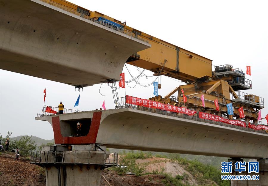 5月13日,運(yùn)架一體機(jī)在位于河南焦作的施工現(xiàn)場(chǎng)進(jìn)行架梁作業(yè)。 當(dāng)日,隨著最后一榀長(zhǎng)24米、重552噸的箱梁架設(shè)就位,太焦高鐵全線橋梁架設(shè)完成。從山西太原到河南焦作的太焦高鐵是國(guó)家規(guī)劃建設(shè)的“八縱八橫”高速鐵路網(wǎng)的重要組成部分,計(jì)劃2020年底建成通車(chē)。 新華社記者李安攝
