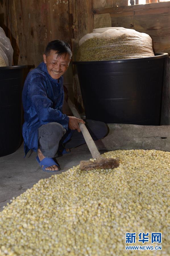 5月14日,在貴州省畢節(jié)市百里杜鵑管理區(qū)黃泥鄉(xiāng)龍?zhí)链逡患揖谱鞣?,村民對玉米進(jìn)行發(fā)酵。貴州省畢節(jié)市百里杜鵑管理區(qū)黃泥鄉(xiāng)龍?zhí)链宓凝執(zhí)凉啪?,因?dú)特的古法釀酒技術(shù),口感獨(dú)特而遠(yuǎn)近聞名。全村有釀酒戶142戶,年產(chǎn)量達(dá)45萬多公斤,龍?zhí)凉啪七h(yuǎn)銷重慶、廣東、浙江等地,龍?zhí)凉啪埔殉蔀辇執(zhí)寥嗽鍪盏闹匾獊碓?。新華社記者楊楹攝