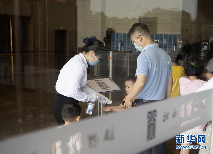 5月17日,在江西省博物館新館,參觀者入館前測量體溫。江西省博物館新館在做好疫情防控的前提下有序開放,公眾可通過網(wǎng)上預約參觀游覽。新華社記者張浩波攝