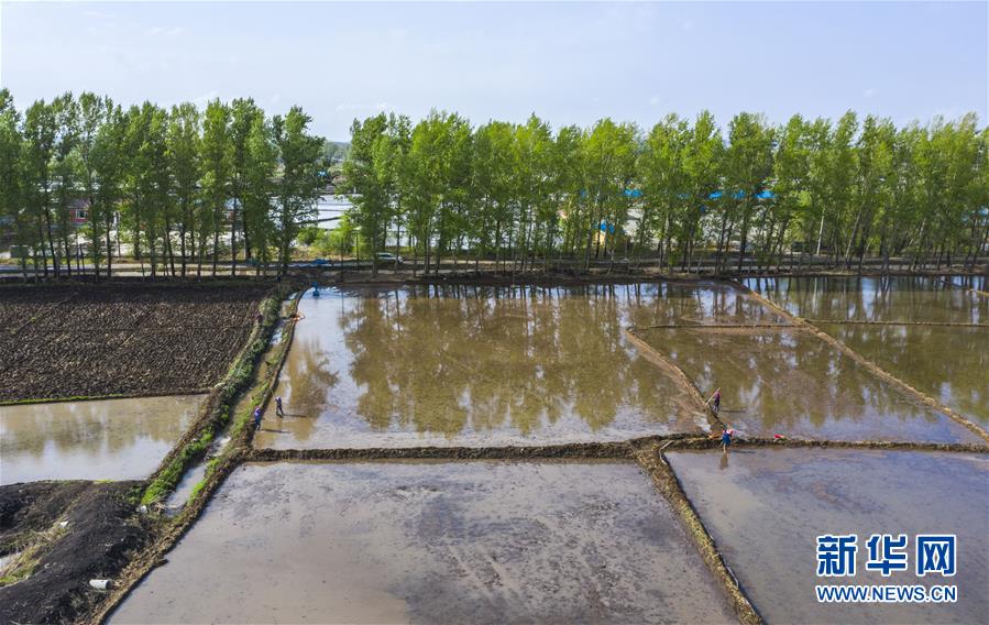 5月17日,在吉林省長(zhǎng)春市雙陽區(qū)徐家村,農(nóng)民在水稻田間耕作(無人機(jī)照片)。新華社記者許暢攝