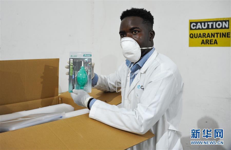 在加納首都阿克拉,加納最大的連鎖藥品供應商mPharma的工作人員整理從中國湖南圣湘生物科技股份有限公司進口的檢測設備(2020年5月6日攝)。新華社記者許正攝
