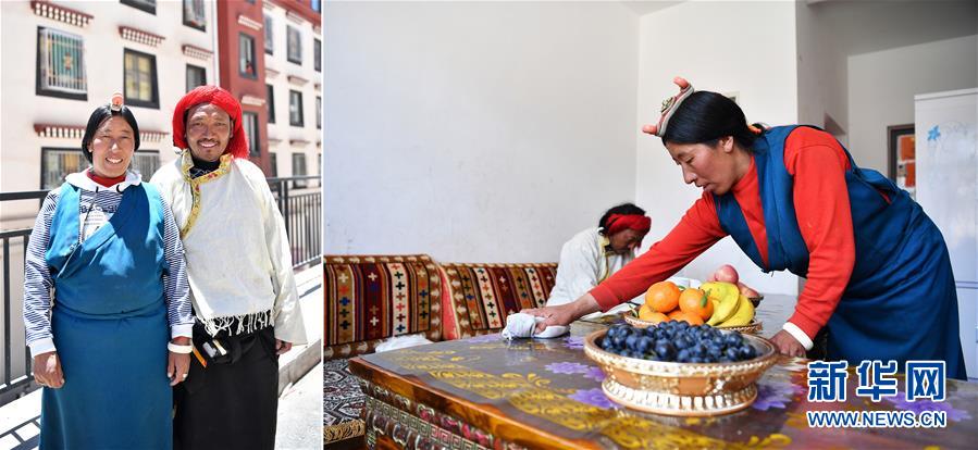 拼版照片:左圖為西藏昌都市八宿縣擁巴鄉(xiāng)娜帕村村民布貢(右)和妻子益西瓊措在安置點樓前;右圖為在八宿縣乃然易地扶貧搬遷安置點,益西瓊措在家里打掃衛(wèi)生。2018年,布貢一家人搬遷到乃然易地扶貧搬遷安置點,住進(jìn)了三室一廳的新居。和布貢一家一樣,八宿縣擁巴鄉(xiāng)、夏里鄉(xiāng)、瓦鄉(xiāng)的2000余名群眾完成易地搬遷,開啟美好的新生活(5月10日攝)。新華社記者詹彥攝
