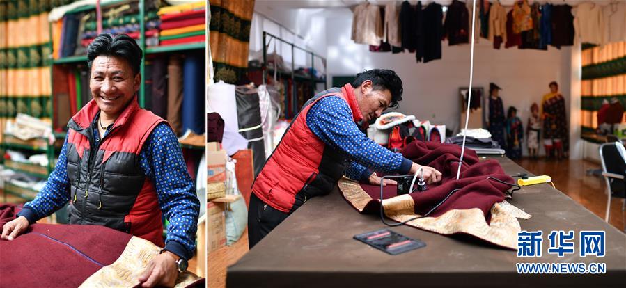 拼版照片:左圖為西藏昌都市江達(dá)縣字嘎鄉(xiāng)塔字村村民扎西江措;右圖為扎西江措在西藏昌都市江達(dá)縣格?;褡宸椉庸やN售公司制作藏裝。扎西江措學(xué)習(xí)藏裝縫制不到兩年時間,已經(jīng)是一名熟練的制衣工,現(xiàn)在月收入4000多元。在此之前,扎西江措靠放牧、四處打零工養(yǎng)活一家人(4月30日攝)。新華社記者詹彥攝