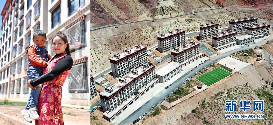 拼版照片:左圖為西藏昌都市八宿縣夏里鄉(xiāng)吉熱村村民次日措姆和兒子加擁羅布在安置點樓前;右圖為八宿縣乃然易地扶貧搬遷安置點一角(無人機(jī)照片)。2018年,次日措姆和家人搬遷到乃然易地扶貧搬遷安置點,住進(jìn)了75平方米的新居。次日措姆還在安置點找到一份保潔員工作,每月有1900元的收入 (5月10日攝)。新華社記者詹彥攝