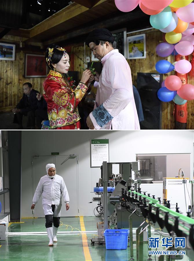 拼版照片上圖:婚禮開始前,吳春霞(左)為施六金佩戴胸花(2018年9月24日攝);下圖:施六金在十八洞村新建的山泉水廠里工作(2018年2月3日攝)。地處武陵山腹地的湖南湘西土家族苗族自治州花垣縣十八洞村曾深陷貧困。2013年,村里225戶中有136戶是貧困戶,40歲以上的“光棍兒”有30多人。2014年以來(lái),十八洞村逐漸蛻變。2016年初,結(jié)束外出打工的施六金返鄉(xiāng)辦起“苗家樂”。2017年,村里的十八洞村山泉水廠正式建成投產(chǎn),他受聘成為廠里的技術(shù)工人,每月都有固定工資。隨著日子越過(guò)越好,許多像施六金這樣摘了窮帽的大齡“光棍兒”收獲了愛情,實(shí)現(xiàn)了安居樂業(yè),事業(yè)愛情雙豐收。黨的十八大以來(lái),我們堅(jiān)持以人民為中心的發(fā)展思想,明確了到2020年我國(guó)現(xiàn)行標(biāo)準(zhǔn)下農(nóng)村貧困人口實(shí)現(xiàn)脫貧、貧困縣全部摘帽、解決區(qū)域性整體貧困的目標(biāo)任務(wù)。目前看,脫貧進(jìn)度符合預(yù)期,成就舉世矚目。這些成績(jī)的取得,凝聚了全黨全國(guó)各族人民智慧和心血,是廣大干部群眾扎扎實(shí)實(shí)干出來(lái)的。脫貧摘帽不是終點(diǎn),而是新生活、新奮斗的起點(diǎn)。新華社記者李尕?cái)z