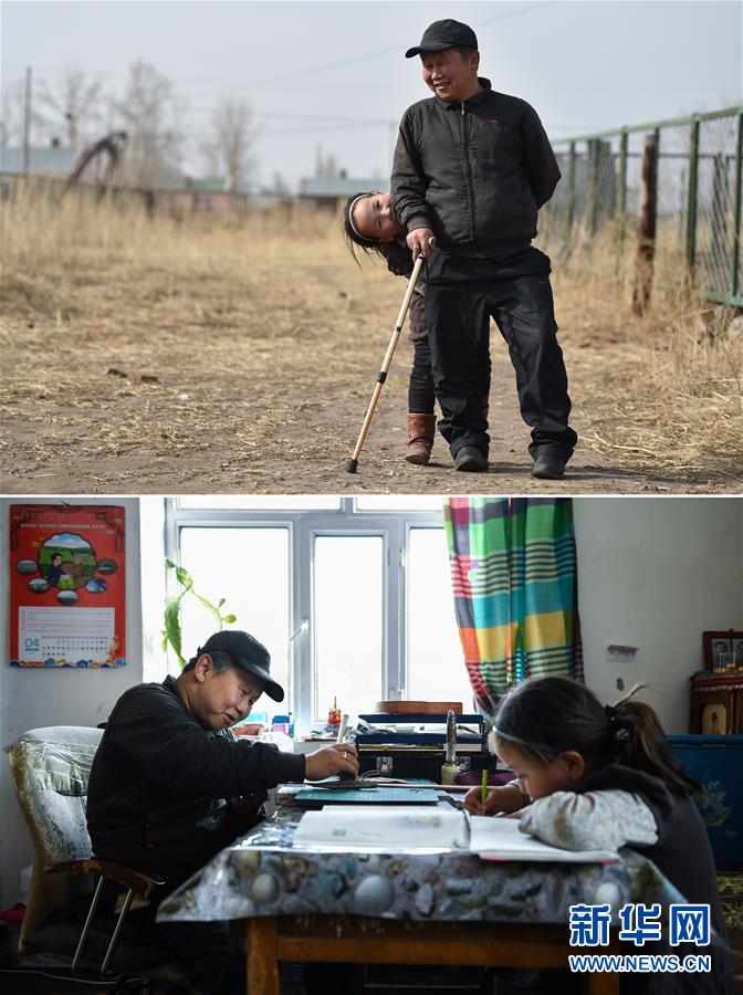 拼版照片上圖:在錫尼河鎮(zhèn)的出租房外,米格木爾(前)和女兒南吉樂瑪一起玩耍;下圖:在錫尼河鎮(zhèn)的出租房?jī)?nèi),米格木爾在進(jìn)行皮雕,女兒南吉樂瑪在溫習(xí)功課(照片均攝于4月15日)。2016年,家住內(nèi)蒙古鄂溫克族自治旗錫尼河鎮(zhèn)孟根礎(chǔ)魯嘎查的米格木爾因?yàn)槿笔趧?dòng)能力成了建檔立卡貧困戶。獨(dú)自撫養(yǎng)女兒的他為了女兒上學(xué)離開了牧區(qū)來(lái)到鎮(zhèn)上租房陪讀,生活的壓力讓米格木爾犯了難。2018年春天,他通過(guò)當(dāng)?shù)孛褡逦幕a(chǎn)業(yè)創(chuàng)業(yè)園舉辦的皮雕手藝培訓(xùn),讓他居家賺錢、陪讀兩不誤,逐步實(shí)現(xiàn)穩(wěn)定脫貧。2020年4月,我國(guó)第一個(gè)成立的少數(shù)民族自治區(qū)——內(nèi)蒙古自治區(qū)宣告全面脫貧“摘帽”。黨的十八大以來(lái),我們堅(jiān)持以人民為中心的發(fā)展思想,明確了到2020年我國(guó)現(xiàn)行標(biāo)準(zhǔn)下農(nóng)村貧困人口實(shí)現(xiàn)脫貧、貧困縣全部摘帽、解決區(qū)域性整體貧困的目標(biāo)任務(wù)。目前看,脫貧進(jìn)度符合預(yù)期,成就舉世矚目。這些成績(jī)的取得,凝聚了全黨全國(guó)各族人民智慧和心血,是廣大干部群眾扎扎實(shí)實(shí)干出來(lái)的。脫貧摘帽不是終點(diǎn),而是新生活、新奮斗的起點(diǎn)。新華社記者劉磊攝