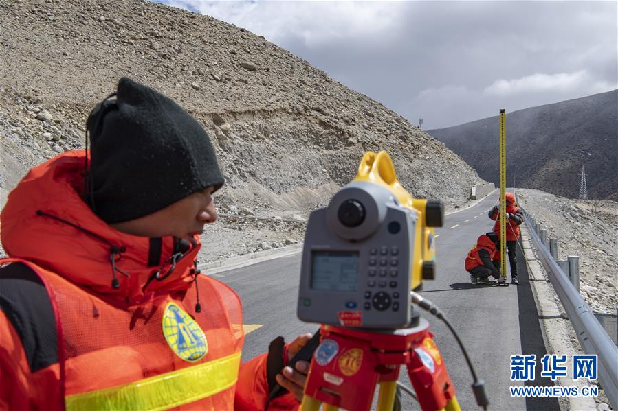 國測一大隊隊員在日喀則市定日縣曲當(dāng)鄉(xiāng)境內(nèi)進行水準(zhǔn)測量(4月18日攝)。新華社記者孫非攝