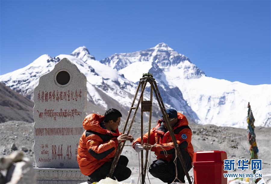 國測一大隊(duì)隊(duì)員在珠峰大本營附近測試設(shè)備(4月27日攝)。新華社記者普布扎西攝