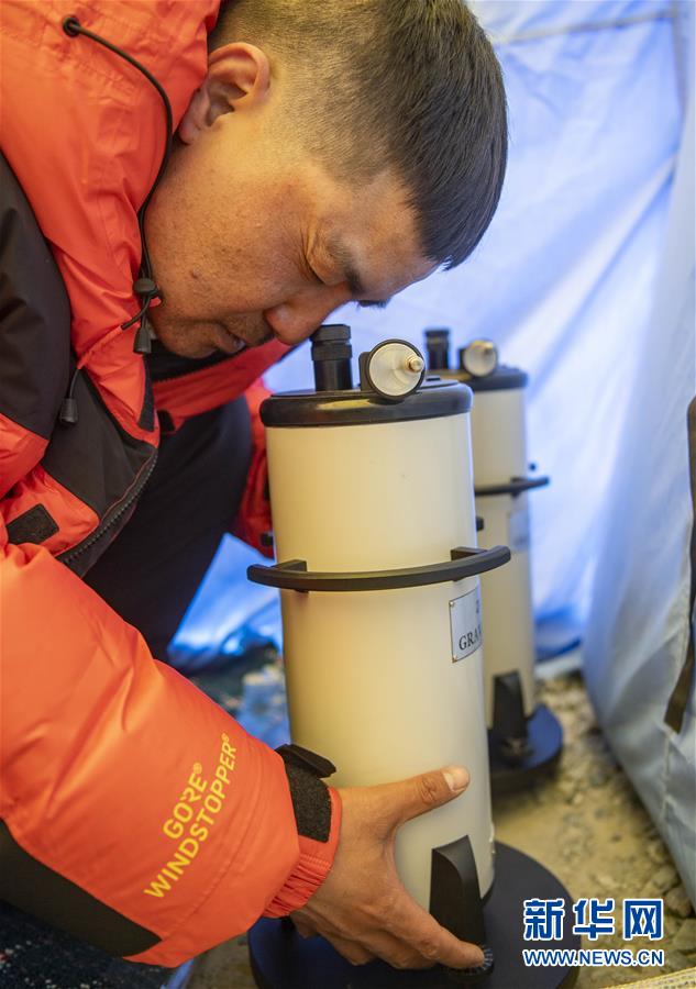 國測一大隊(duì)隊(duì)員在珠峰大本營測試地面測量中使用的重力儀(5月3日攝)。新華社記者晉美多吉攝
