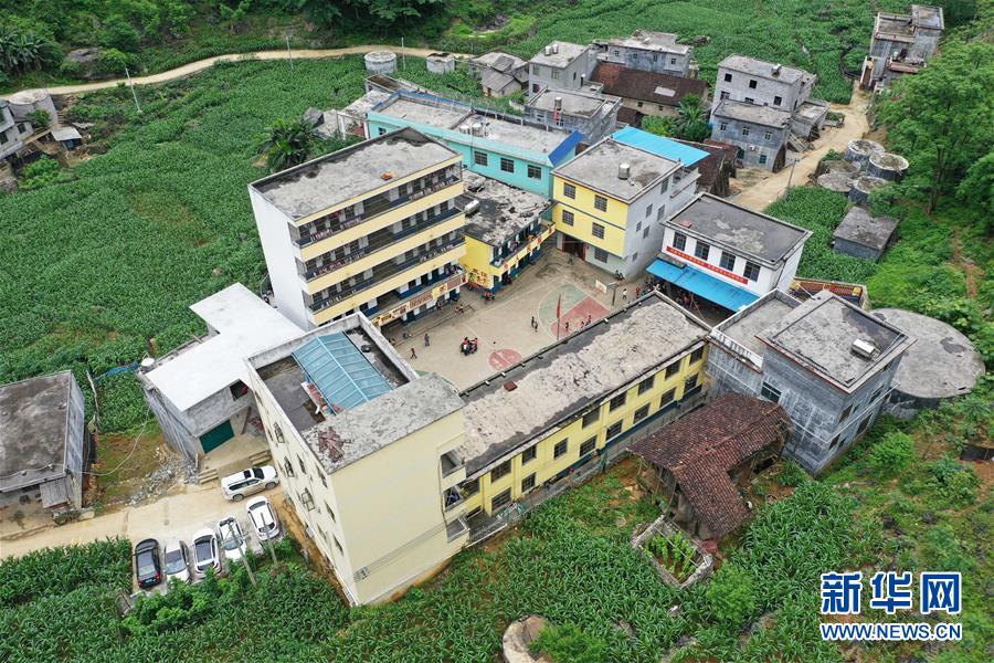 這是面貌煥然一新的廣西大化瑤族自治縣板升鄉(xiāng)弄勇小學(xué)(2019年5月10日攝,無人機照片)。新華社記者黃孝邦攝