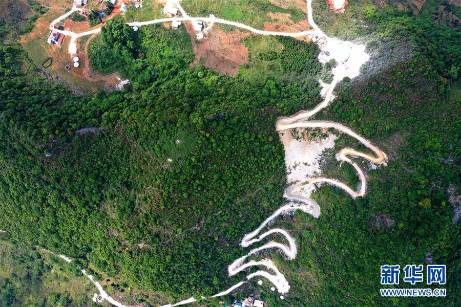 這是在進(jìn)行路面硬化的大化瑤族自治縣弄合村弄魯屯至弄確屯的山路(5月13日攝,無(wú)人機(jī)照片)。新華社記者周華攝