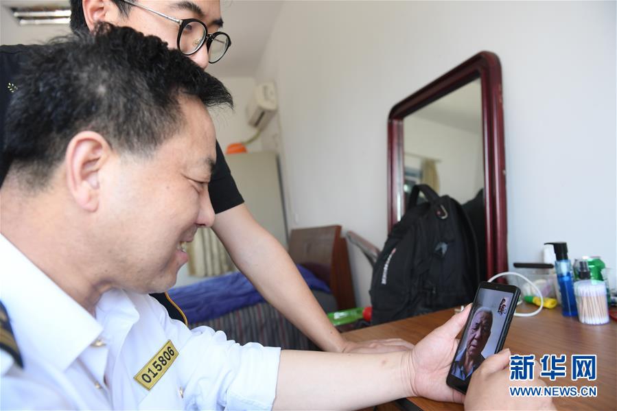 5月20日,在寧波七里嶼,前來(lái)運(yùn)送物資的葉家第四代燈塔工葉靜虎(前)和兒子葉超群在宿舍內(nèi)跟第三代燈塔工葉中央視頻通話。葉超群自2013年起在七里嶼燈塔工作,葉靜虎從燈塔工崗位上退下來(lái)后,目前在寧波航標(biāo)處后勤事務(wù)中心工作。新華社記者翁忻旸攝