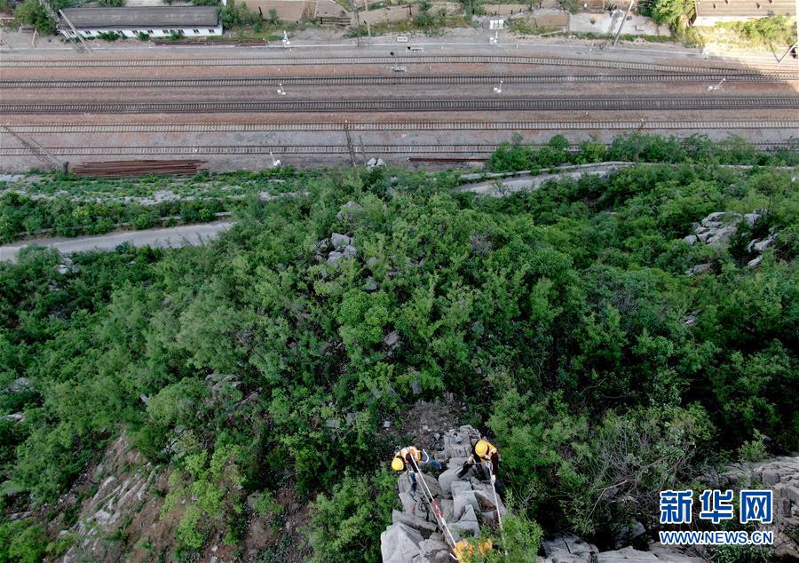 5月21日,捅山工胡軍從山頂垂降,準(zhǔn)備開(kāi)始捅山作業(yè)。新華社記者郝源攝