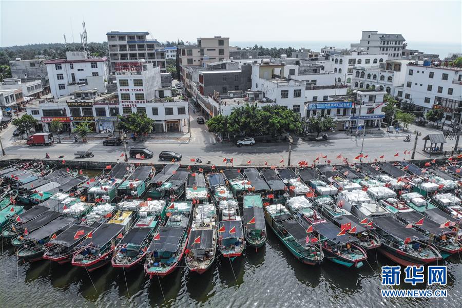 這是5月21日拍攝的??吭诤D檄偤J刑堕T鎮(zhèn)的漁船(無人機(jī)照片)。5月1日12時起,我國渤海、黃海、東海和北緯12度以北的南海海域進(jìn)入海洋伏季休漁期。海南瓊海市潭門鎮(zhèn)的漁民利用休漁時間對船體、機(jī)械設(shè)備、網(wǎng)具等進(jìn)行維修、保養(yǎng),保證休漁結(jié)束后以最好狀態(tài)出海捕撈。新華社記者張麗蕓攝