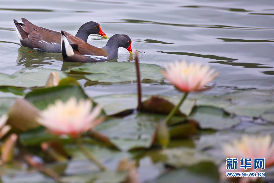 5月22日,兩只紅嘴水雞在蓮葉間游弋。近日,貴陽(yáng)市觀山湖公園內(nèi)大片盛開(kāi)的蓮花吸引了不少水鳥(niǎo)在其間嬉戲覓食。新華社記者劉續(xù)攝