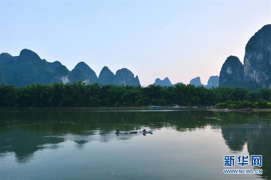 這是在廣西桂林市陽朔縣興坪鎮(zhèn)拍攝的山水風(fēng)光(5月19日攝)?!吧n蒼森八桂,茲地在湘南。江作青羅帶,山如碧玉篸……”一千多年前,唐朝詩人韓愈寫盡桂林山水之美。初夏時節(jié),在廣西桂林市陽朔縣興坪鎮(zhèn),藍天白云下,煙雨朦朧中,桂林山水盡顯秀美。新華社記者 曹祎銘 攝