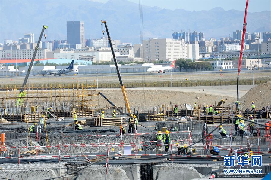 5月23日,工人在烏魯木齊機場改擴建工程施工現(xiàn)場作業(yè)。新華社記者丁磊攝