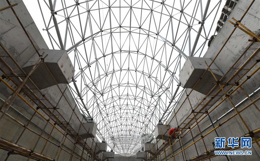 5月23日,工人在海口文明東越江通道項(xiàng)目隧道內(nèi)安裝照明設(shè)備。新華社記者楊冠宇攝