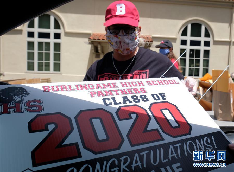 5月22日,在美國(guó)加州北部圣馬特奧縣,工作人員歡迎來(lái)辦理畢業(yè)手續(xù)的學(xué)生。新華社記者吳曉凌攝