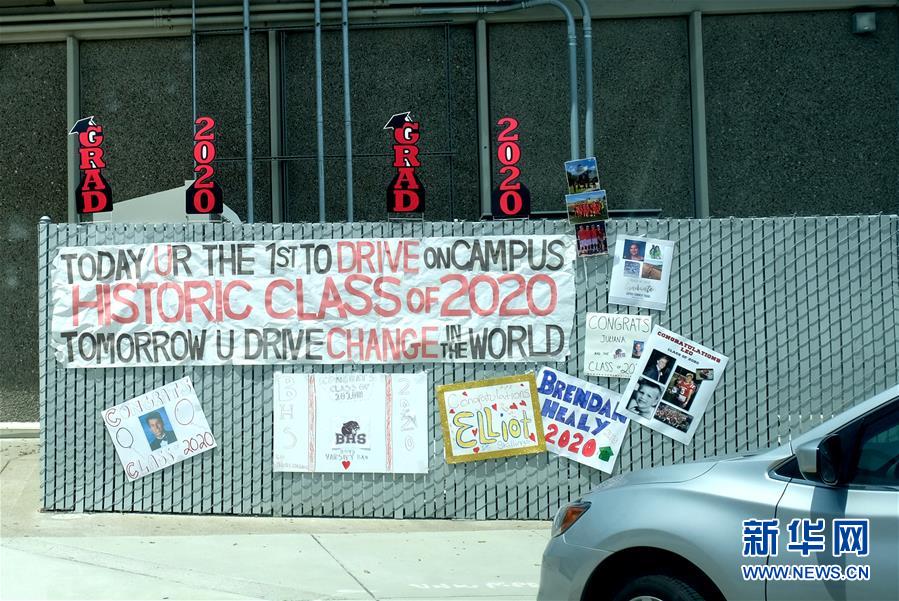 這是5月22日在美國(guó)加州北部圣馬特奧縣伯靈格姆高中拍攝的歡迎畢業(yè)生的海報(bào)。新華社記者吳曉凌攝