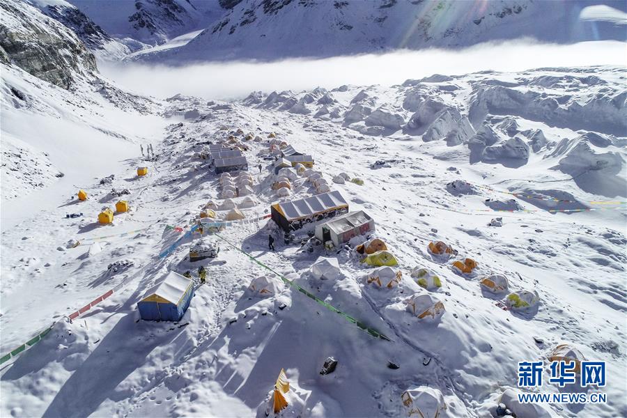 位于珠峰東絨布冰川旁海拔6500米的珠峰前進(jìn)營地(5月22日攝,無人機(jī)照片)。新華社記者晉美多吉攝