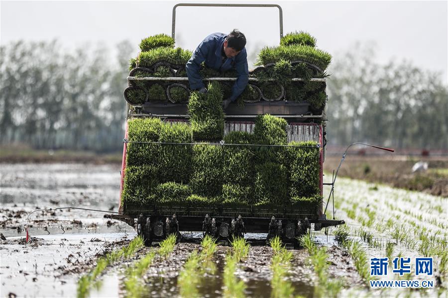 5月24日,盤錦市大洼區(qū)的農(nóng)民在駕駛插秧機(jī)插秧。新華社記者潘昱龍攝