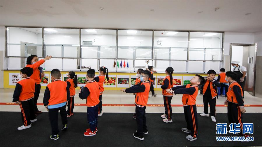 5月25日,廣州市荔灣區(qū)蔣光鼐紀(jì)念小學(xué)的老師在教學(xué)生防疫知識(shí)。當(dāng)日,廣州市各小學(xué)一至三年級(jí)學(xué)生正式開學(xué)復(fù)課。至此,廣州市中小學(xué)各年級(jí)已全部開學(xué)復(fù)課。新華社記者盧漢欣攝