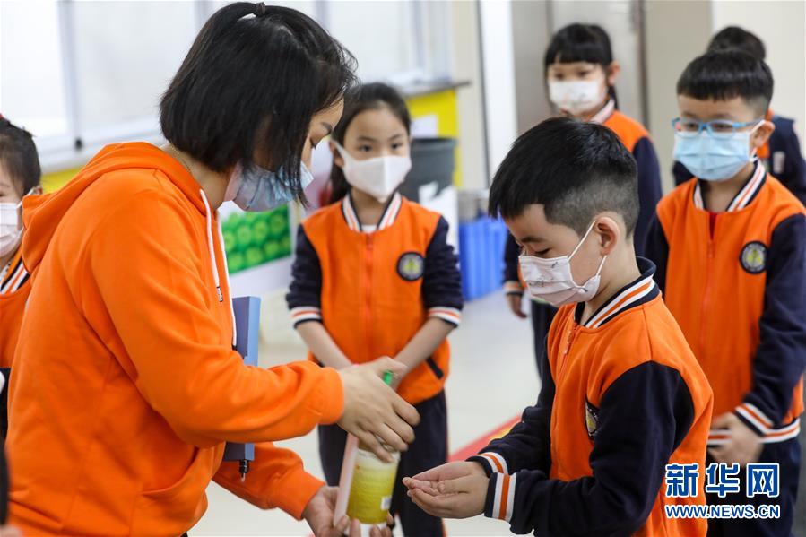 5月25日,廣州市荔灣區(qū)蔣光鼐紀(jì)念小學(xué)的老師在校門口指導(dǎo)返校的學(xué)生進(jìn)行手部消毒。當(dāng)日,廣州市各小學(xué)一至三年級(jí)學(xué)生正式開學(xué)復(fù)課。至此,廣州市中小學(xué)各年級(jí)已全部開學(xué)復(fù)課。新華社記者盧漢欣攝