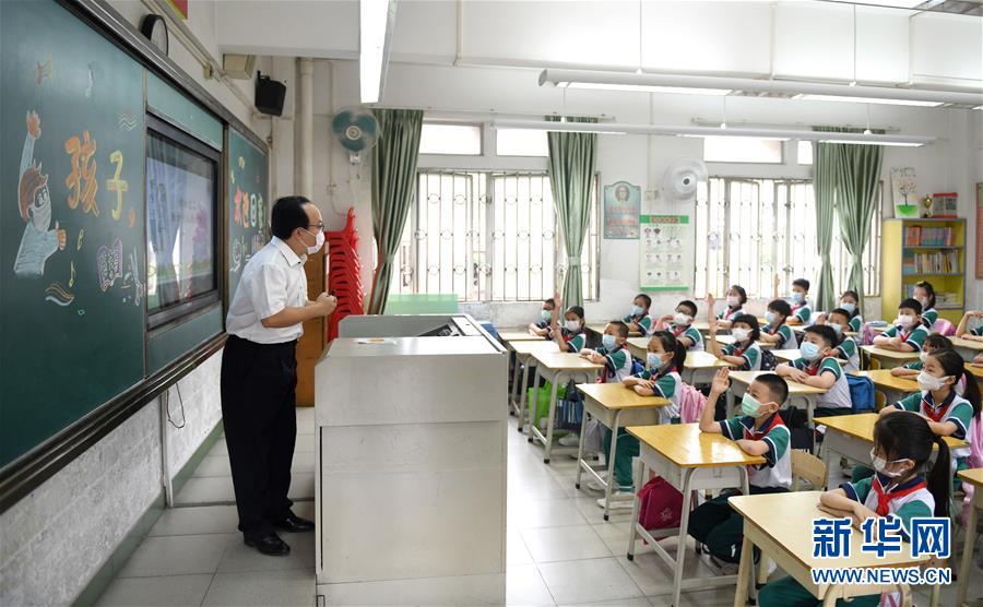 5月25日,廣州市荔灣區(qū)蔣光鼐紀(jì)念小學(xué)的老師在給學(xué)生上開學(xué)第一課。當(dāng)日,廣州市各小學(xué)一至三年級(jí)學(xué)生正式開學(xué)復(fù)課。至此,廣州市中小學(xué)各年級(jí)已全部開學(xué)復(fù)課。新華社記者盧漢欣攝