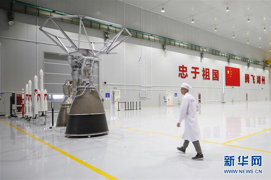 5月26日,工作人員走過藍箭航天智能制造基地發(fā)動機裝配區(qū)內(nèi)的火箭模型。新華社記者張玉薇攝