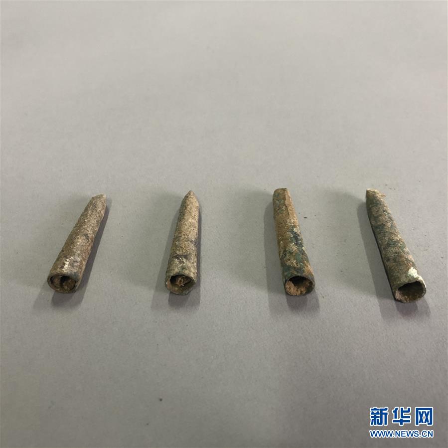 黃河邊大型古墓群出土的一組青銅材質的筆帽(5月22日攝)。新華社記者李麗靜攝