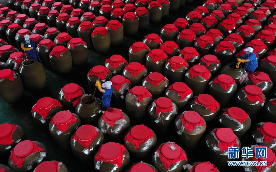 5月26日,工人在貴州省黔東南苗族侗族自治州麻江縣明洋食品公司生產(chǎn)車間攪拌釀造過程中的酸湯原料。