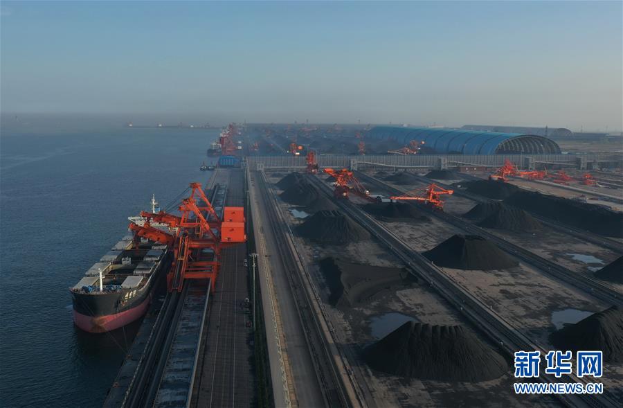 5月22日,一艘輪船靠泊在唐山港曹妃甸港區(qū)煤碼頭三期工程的先期工程泊位裝貨(無人機照片)。新華社記者楊世堯攝