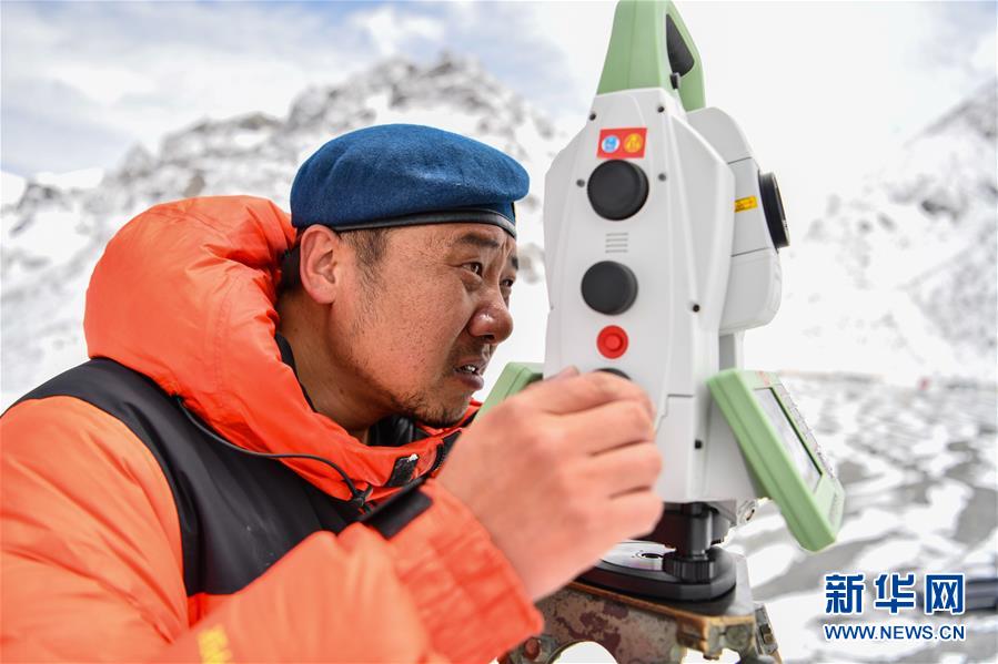 當(dāng)日,2020珠峰高程測量登山隊成功登頂后,在珠峰大本營的珠峰高程起算點,自然資源部第一大地測量隊隊員利用全站儀等儀器對珠穆朗瑪峰峰頂進(jìn)行交會觀測。
