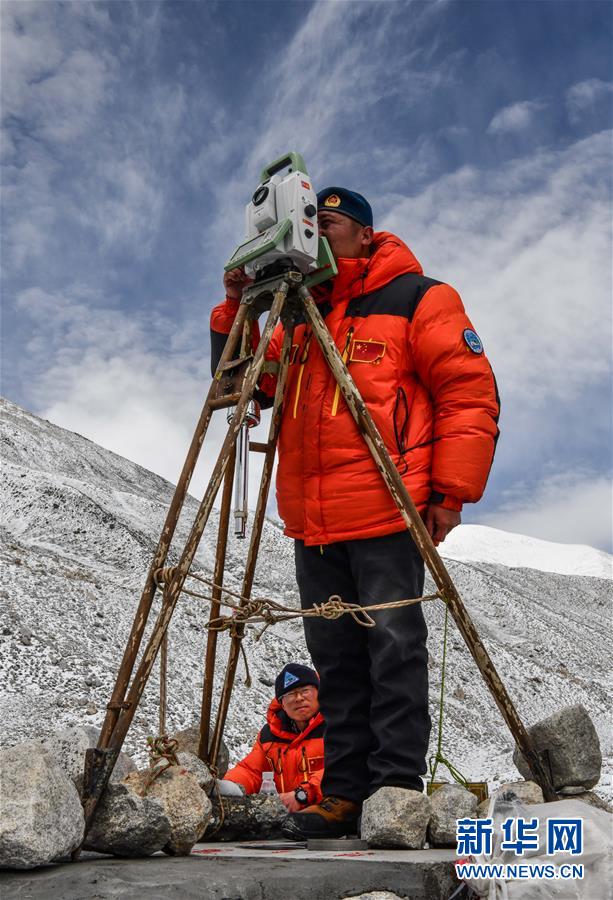 自然資源部第一大地測量隊隊員鄭林(站立者)和武光偉在對珠峰峰頂進(jìn)行交會觀測(5月27日攝)。新華社記者普布扎西攝