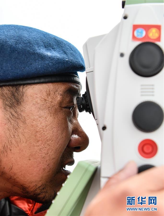 自然資源部第一大地測(cè)量隊(duì)隊(duì)員鄭林在使用全站儀對(duì)珠峰峰頂進(jìn)行交會(huì)觀測(cè)(5月27日攝)。新華社記者晉美多吉攝