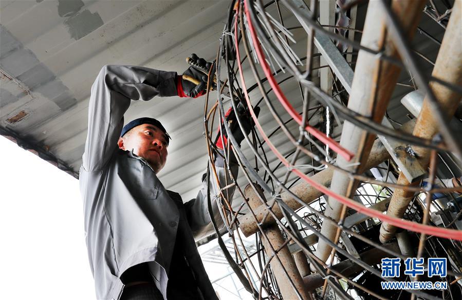 5月27日,制作團隊成員李剛在中轉(zhuǎn)服務(wù)站工棚內(nèi),用廢舊鋼絲制作牛造型工藝品的身體部分。新華社記者方喆攝