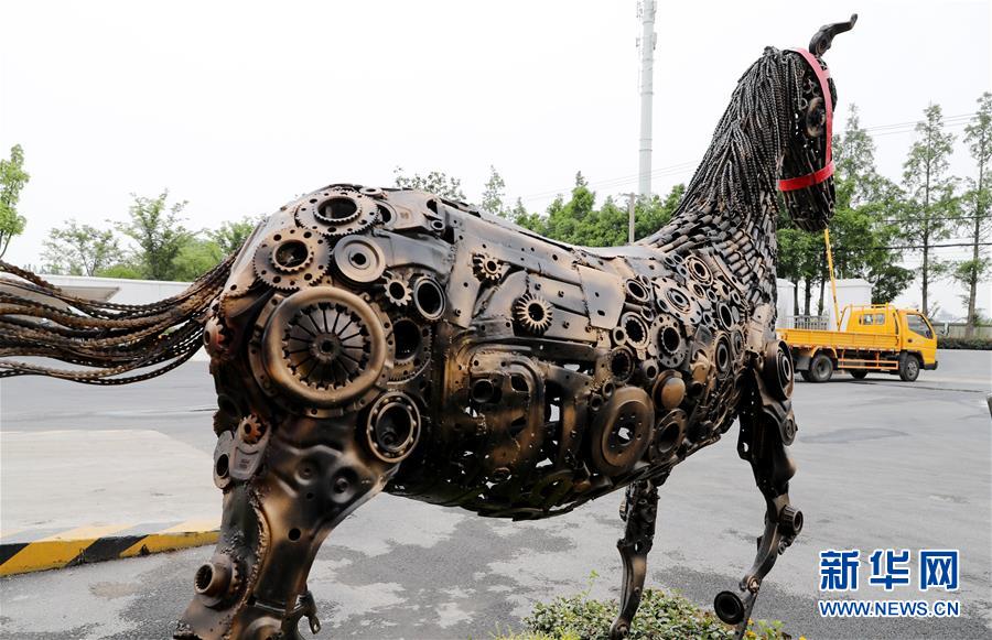 利用廢舊汽車零部件制作的馬造型工藝品擺在中轉(zhuǎn)服務(wù)站內(nèi)(5月27日攝)。新華社記者方喆攝