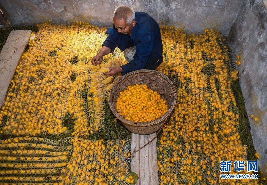 5月27日,桐鄉(xiāng)市鳳鳴街道建勝村70歲的村民宋柏明在收獲“黃金繭”。他今年在桐鄉(xiāng)興民蠶業(yè)專(zhuān)業(yè)合作社的指導(dǎo)下首次養(yǎng)3張黃金蠶繭種,收獲“黃金繭”近400斤,比往年同期增收1500元。近期,蠶桑之鄉(xiāng)浙江省桐鄉(xiāng)市的蠶農(nóng)們迎來(lái)了蠶繭豐收的季節(jié),其中新品種“黃金繭”的增收效果尤其明顯。據(jù)介紹,與普通蠶絲相比,色澤金黃的黃金蠶絲中葉黃素含量高,抗菌效果更好,深受市場(chǎng)青睞。2020年春季,浙江省桐鄉(xiāng)市共計(jì)發(fā)放黃金蠶繭種1225張,產(chǎn)量預(yù)計(jì)75噸,總產(chǎn)值近300萬(wàn)元,較普通蠶繭增收約20%,成為當(dāng)?shù)剞r(nóng)業(yè)增收的亮點(diǎn)。浙江省桐鄉(xiāng)市是我國(guó)蠶桑的重要產(chǎn)地,“桐鄉(xiāng)蠶桑習(xí)俗”也被國(guó)務(wù)院列入第二批國(guó)家級(jí)非物質(zhì)文化遺產(chǎn)名錄。新華社記者徐昱攝