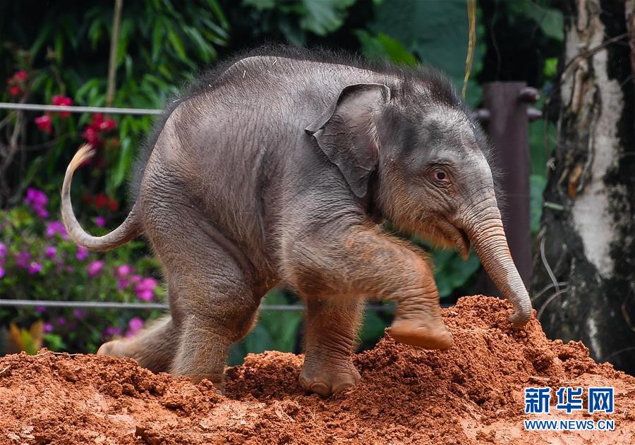 5月27日,廣州長(zhǎng)隆的新生亞洲象寶寶在紅泥堆玩耍,這些泥土可以幫助大象護(hù)理皮膚和補(bǔ)充鹽分。新華社記者劉大偉攝