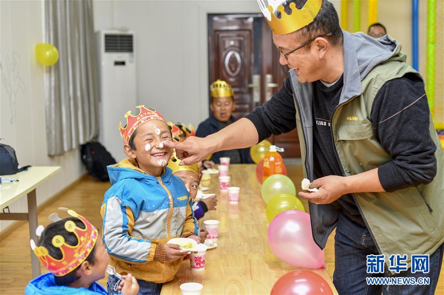 5月27日,玉麥鄉(xiāng)小學(xué)校長(zhǎng)朗杰和孩子們一起慶?!吧铡?。新華社記者王炳坤攝
