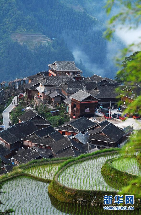 這是從江縣加榜鄉(xiāng)加車苗寨和梯田(5月28日攝)。夏日時(shí)節(jié),位于貴州省黔東南苗族侗族自治州從江縣加榜鄉(xiāng)加車、加頁、黨扭等苗寨的梯田在晨霧與陽光的映襯下線條分明,光影變幻,景色如畫。新華社記者 楊文斌 攝