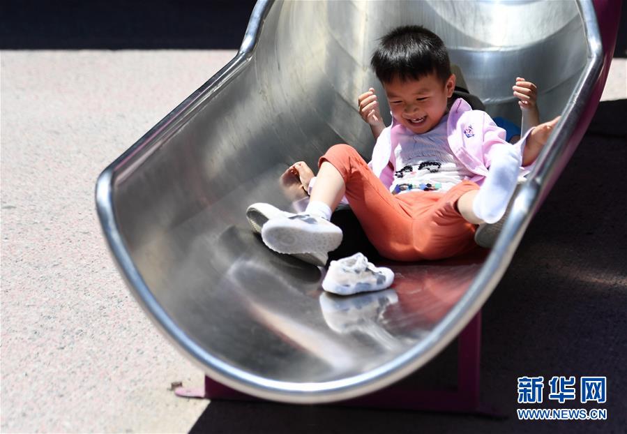 5月31日,小朋友在北京五棵松華熙Live滑滑梯。新華社記者張晨霖?cái)z